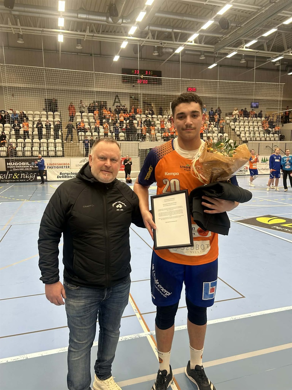 Jan Andersson, pappa till Hampus och pristagare Amin Bouzguenda. I samband med herrarnas match mot Anderstorps SK i semioff kvalet till Herrallsvenskan delade Hampus Anderssons Minnesfond ut årets stipendie. Årets prista (...)